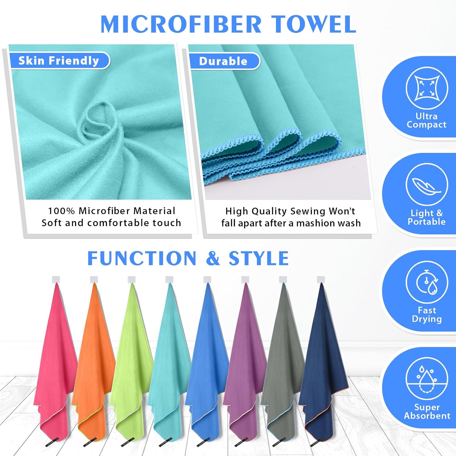 - LIGHTWEIGHT & EASY TO CARRY: Each quick dry towel set with a breathable carry bag and snap hook on the quick-release buckle provides a handy attachment point. The microfiber cloth material makes camping towel very thin. Large size but still super compact, portable and convenient. It can be rolled up small when you don't need to use it. The compact travel towel will nicely fit in your gym bag or backpack. Ideal for outdoor, camping, gym, yoga, hiking, backpacking, fitness and workout.