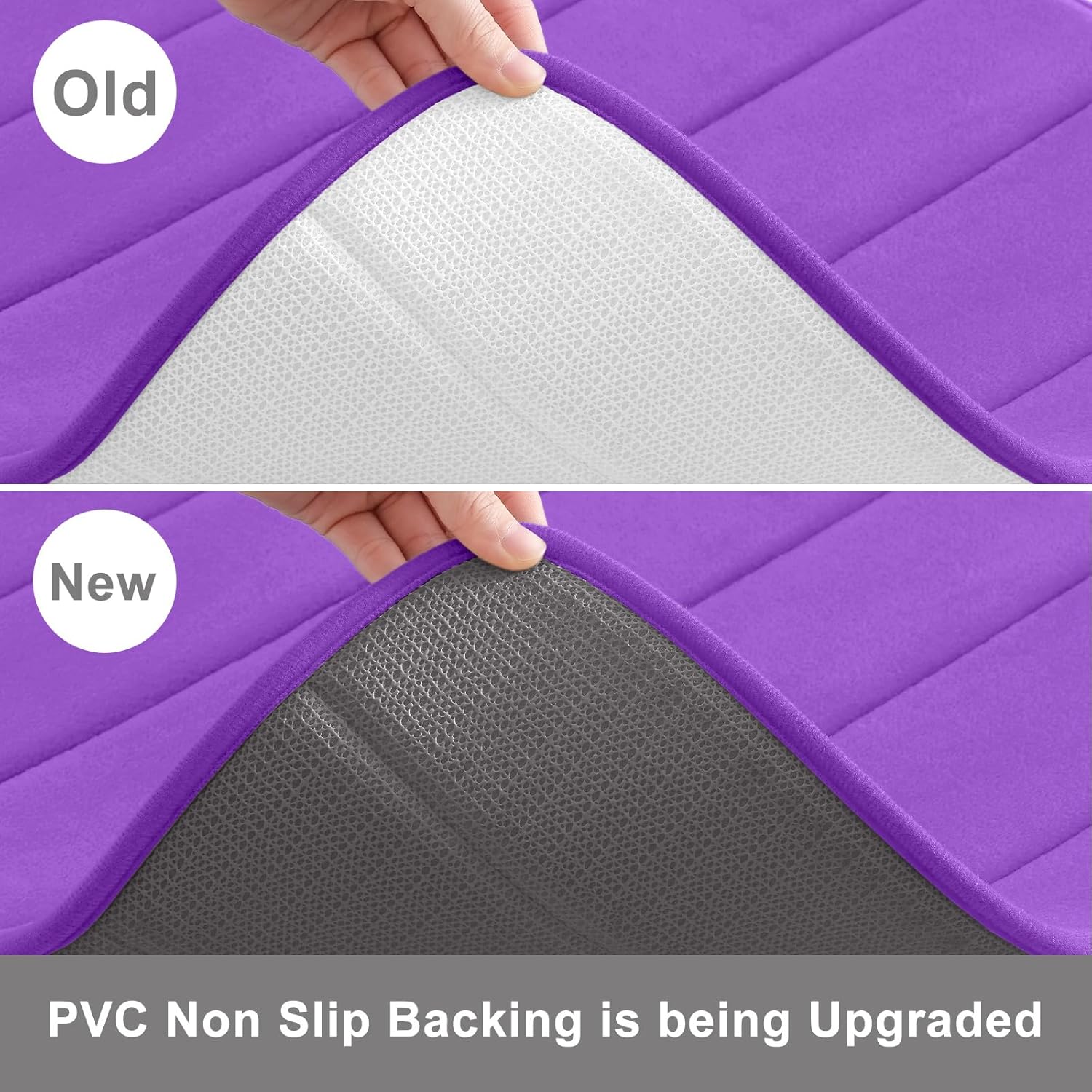 - NON-SLIP PVC BACKING: Bathroom mats feature a non-slip mesh back to prevent the mat from shifting and skidding, and the rubber back prevents water from seeping to the soft surface. WARNING: Place mat on CLEAN DRY SMOOTH FLOOR only. Water under bath mats can cause it to slip. Keep bottom of mat dry. Before using bath carpet, test with foot to ensure it doesn't move