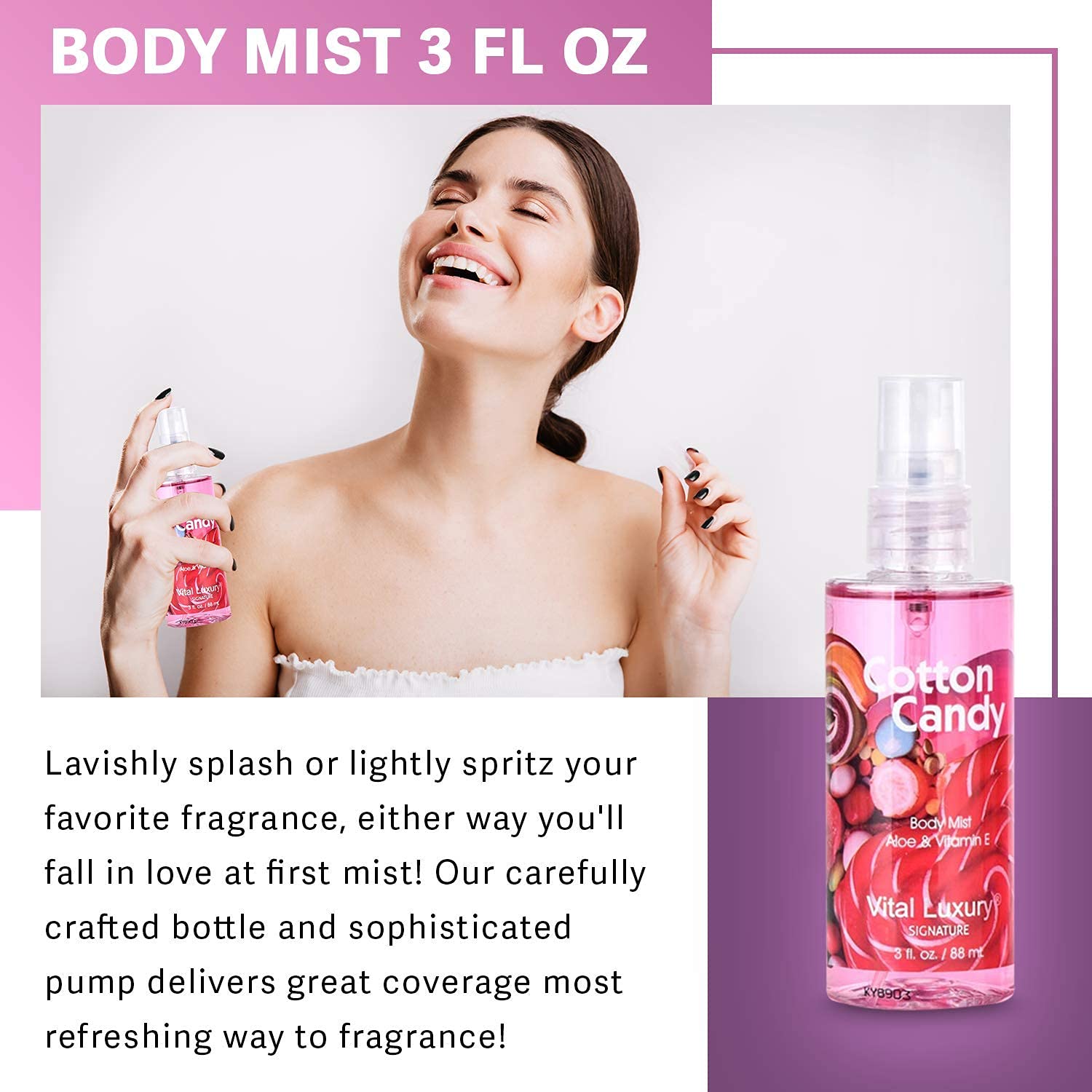 - Body Mist3 fl.oz:lavishly splash or lightly spritz your favorite fragrance, either way you'll fall in love at first mist! Our carefully crafted bottle and sophisticated pump delivers great coverage most refreshing way to fragrance!