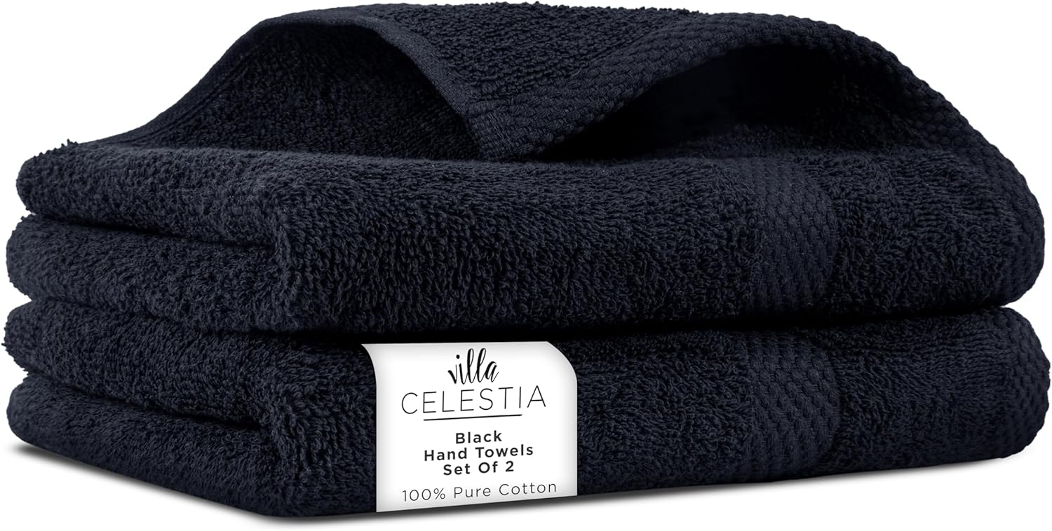 100% Cotton Hand Towel Set of 2, (16 x 28 inches) Sustainable, Soft, Highly Absorbent, Quick Drying, Combed Cotton Hand Towels Pack of 2 Ideal for Hotels, Spa, Bathroom, Dorm, Black