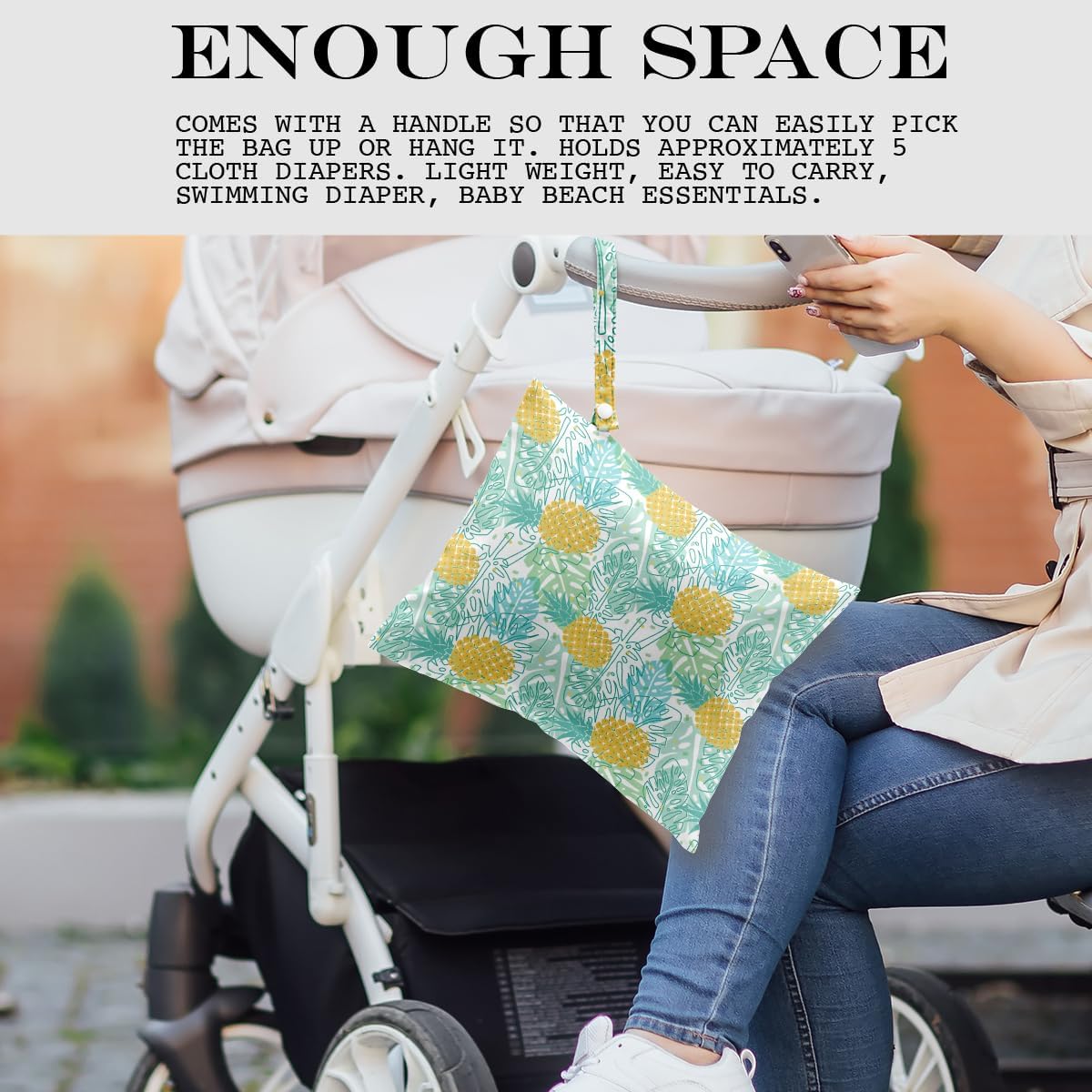 - ENOUGH SPACE - 26cm x 32cm (approx.: 12.5” x 10.2”). Comes with a handle so that you can easily pick the bag up or hang it. Holds approximately 5 cloth diapers. Light weight, easy to carry, swimming diaper, beach essentials.