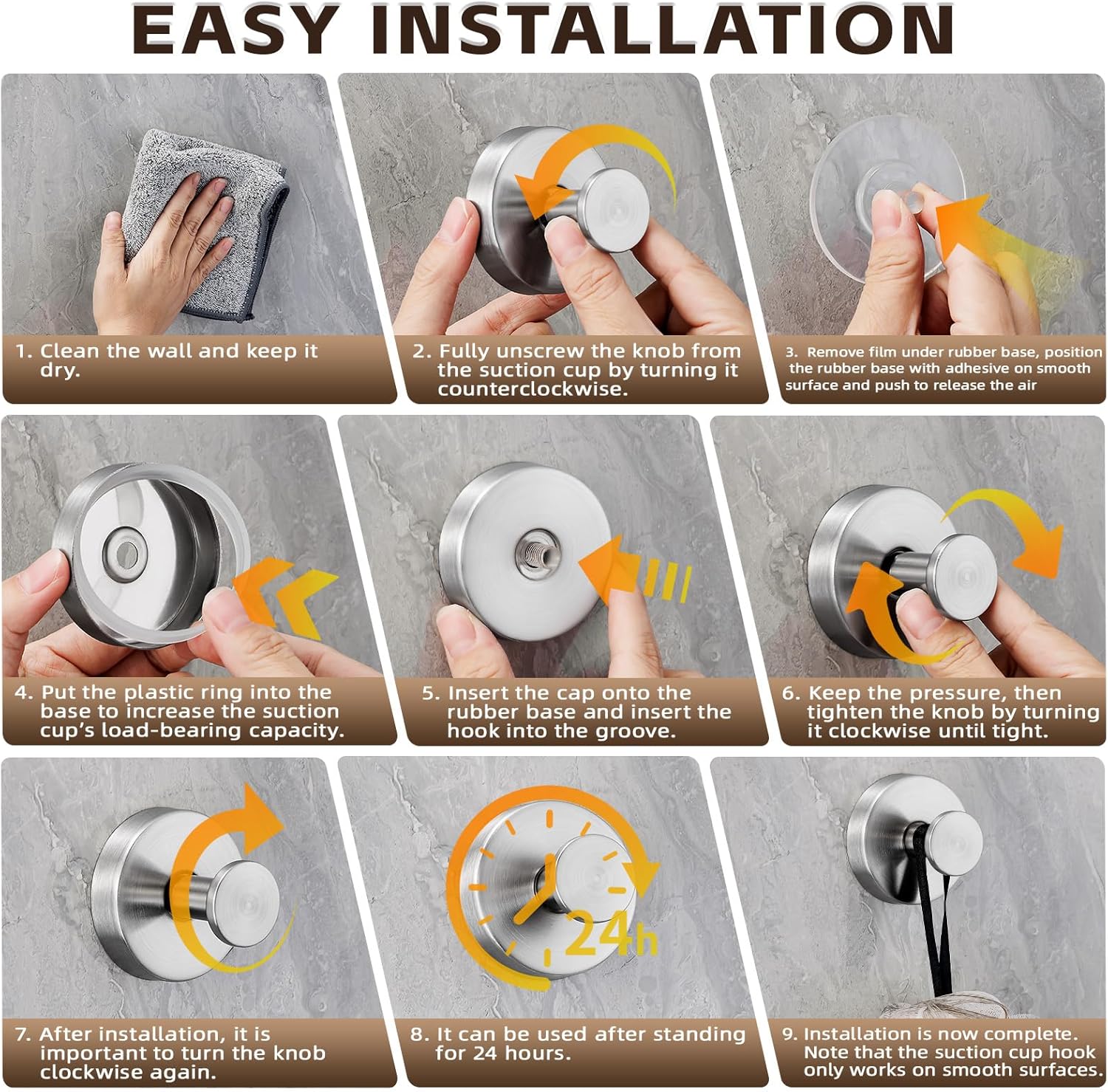 - Wall-Mounted Towel Hooks for Bathroom/ Easy-Install Shower Hooks: Say goodbye to drilling holes! Our towel hooks for bathroom wall mounted utilize advanced vacuum suction technology to attach securely to glass, stainless steel, or polished tiles. Built-in self-adhesive base forms an air-tight vacuum seal on glass, tile, stainless steel and other smooth Non-Porous surfaces โ works even in wet bathrooms! Align hook vertically Then press firmly to expel air and lock it.these bathroom suction hooks support umbrellas, coats, flower wreaths, and kitchen supplies - perfect for renters who value reusable and removable storage solutions!