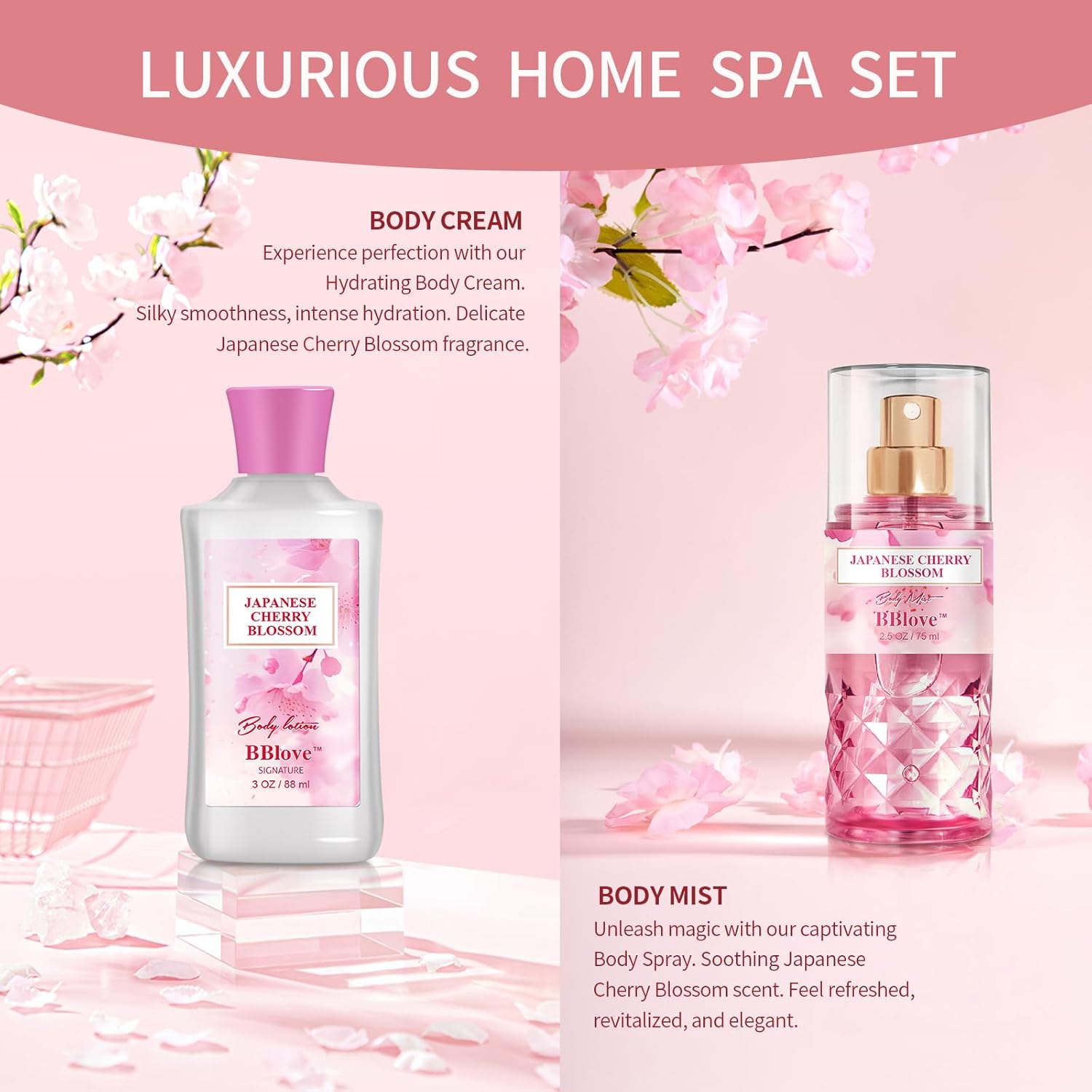 - Hydration & Long-Lasting Fragrance:The body lotion deeply moisturizes with natural extracts, leaving skin silky smooth, while the mist refreshes and locks in the enchanting cherry blossom aroma. Together, they elevate your skincare routine