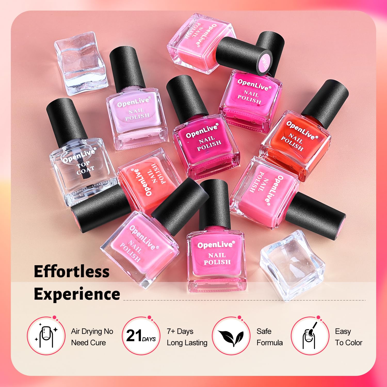 - 【Vivid Color Display】Each color in the OpenLive nail polish set is highly colors, providing a rich and vivid color payoff.From bright, bold hues to soft, subtle shades, look even more beautiful on your nails. The base coat helps to enhance the color of the polish, while the top coat adds an extra layer of shine and protection to the nails.