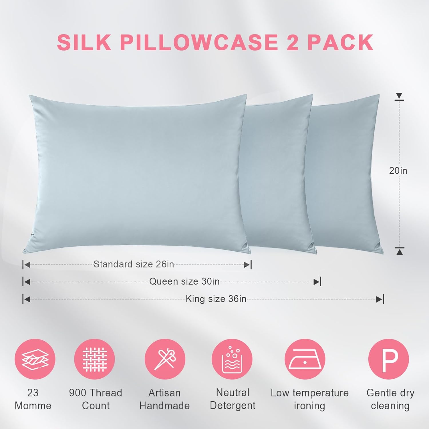 100% Silk Pillowcase 2 Pack for Hair and Skin, Both Sides 23 Momme Grade 6A+ Mulberry Silk Pillowcases with Hidden Zipper, Soft&Smooth Cooling Pillow Cases (Ash Blue, Standard 20×26)